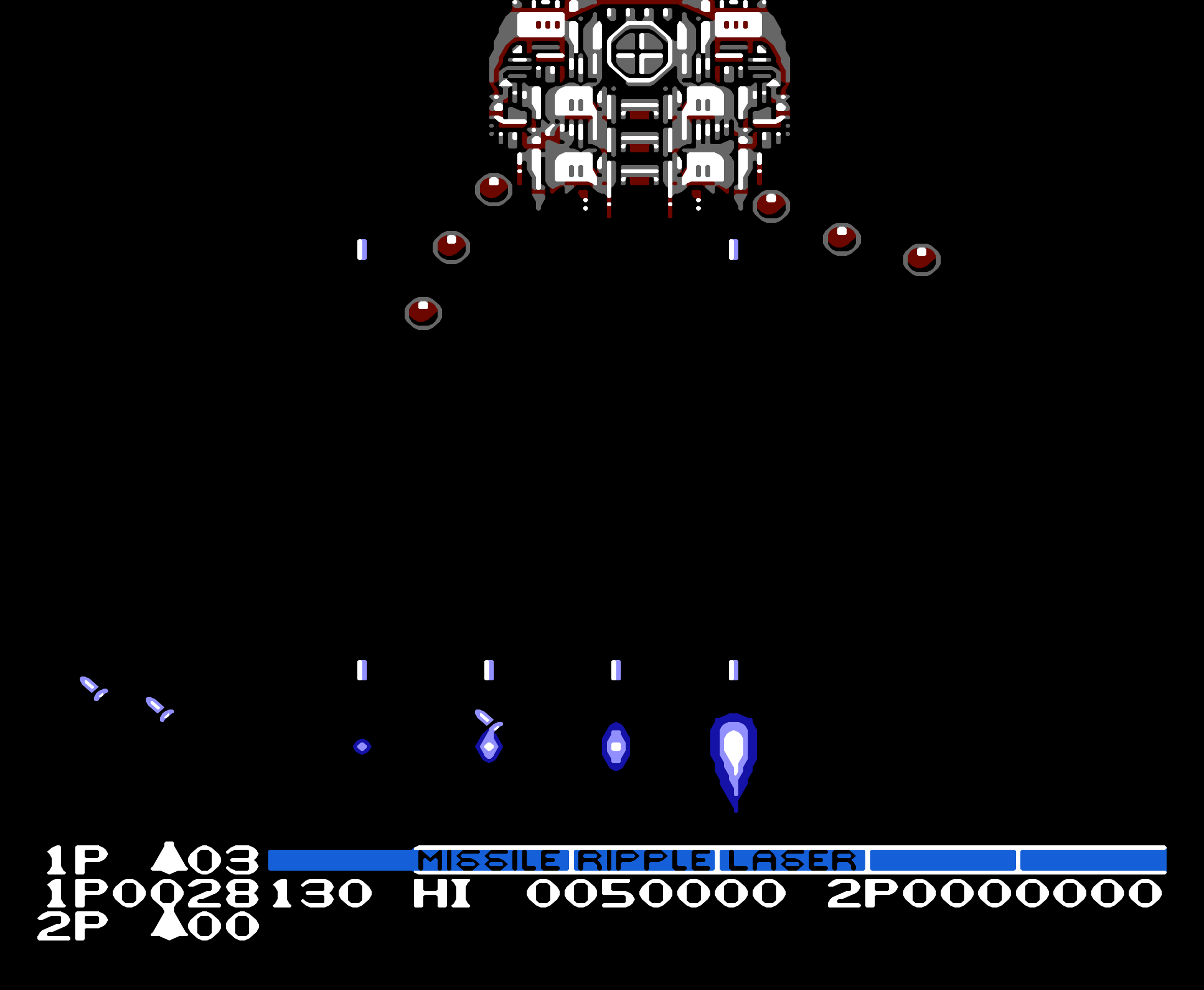 众所周知如果不加 SPEED 的话,第一关的 BOSS 都过不去。小时候是怎么打通六大关的呢?这就要归功于盗版商的提供的一个特殊版本。