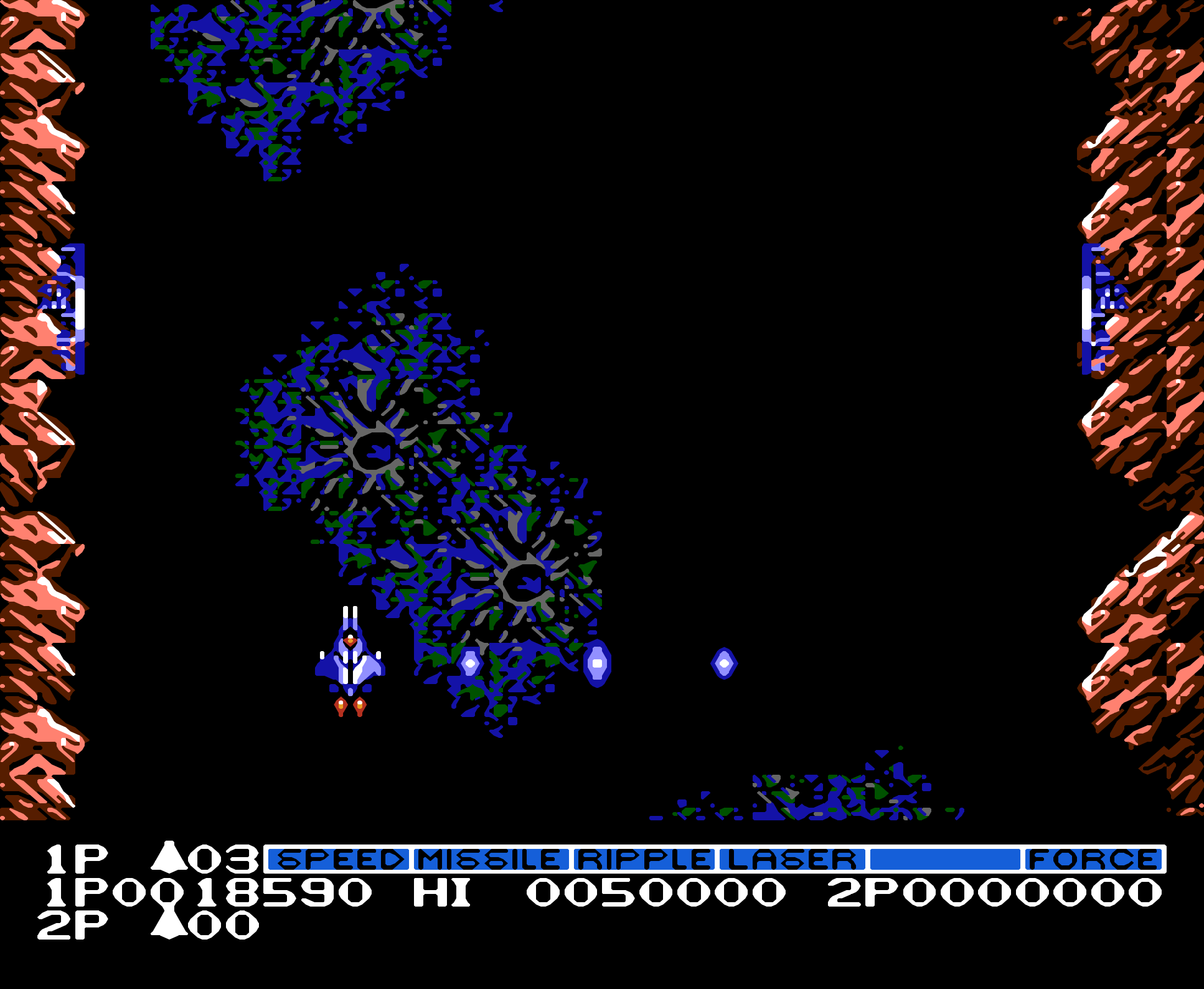 后来才明白这是怎么一回事:上面提到的六件物品中最后一件是 FORCE。有了 FORCE 之后,飞机会被蓝色光芒包围,可以抵挡敌人子弹。